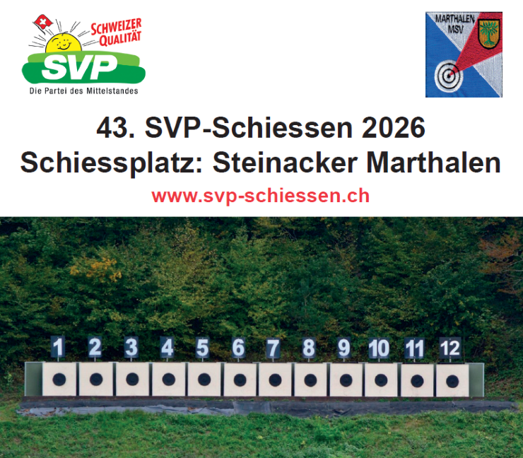 Das kantonale SVP-Schiessen 2026 wird von der SVP gemeinsam mit dem Militärschiessverein Marthalen organisiert und ist nicht nur für aktive Schützinnen und Schützen ein Erlebnis. Auch Gäste und Besucherinnen und Besucher sind herzlich eingeladen, vorbeizukommen, die besondere Atmosphäre auf der Schiessanlage Im Steinacker zu erleben und die Festwirtschaft zu geniessen.